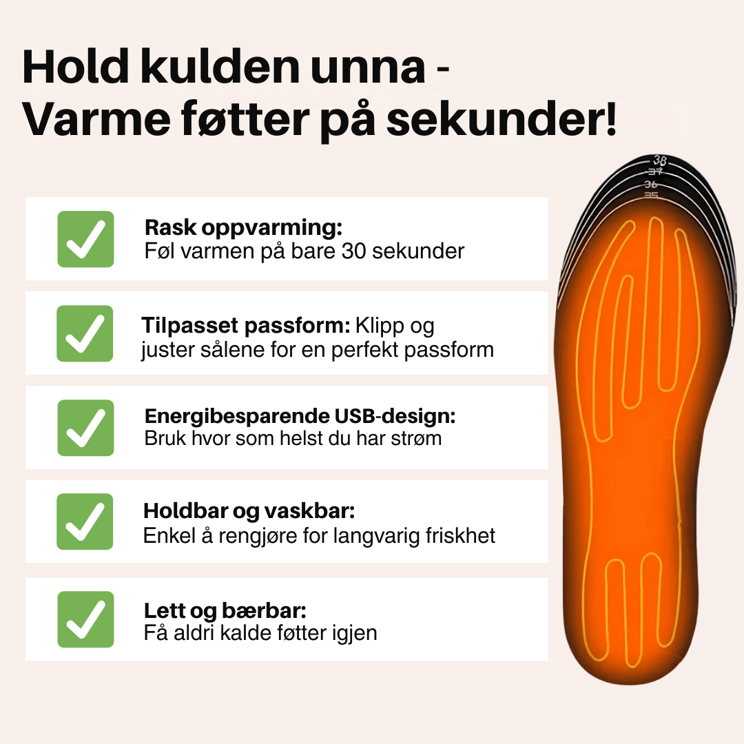 Optimaliserte søkeord: varmesåler, USB termiske såler, oppvarmede såler, vintersåler, vaskbare såler, tilpassbare såler, fotvarme, varmeinnlegg til sko, USB varmesåler, varme føtter, løsning for kalde føtter, termiske såler for vinterbruk.
