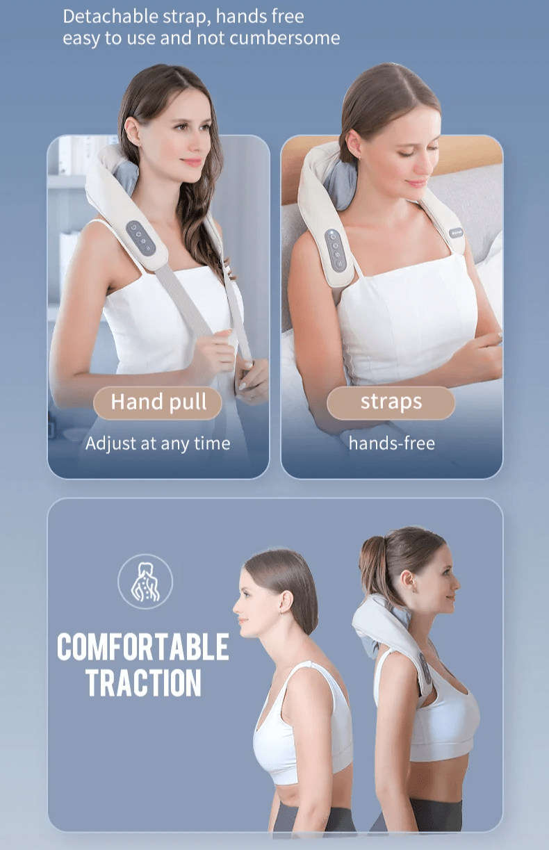 TrapeziusRelief har 6 massasjehoveder som etterligner en profesjonell massørs grep. De 4 øverste hodene arbeider nakken og skuldrene, mens de 2 nederste presser ned på trapeziusmuskelen – akkurat som når noen masserer deg bakfra.