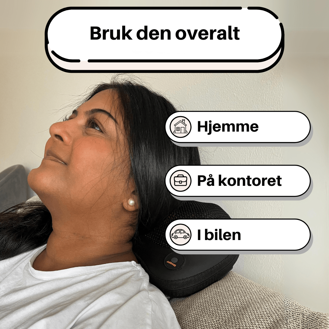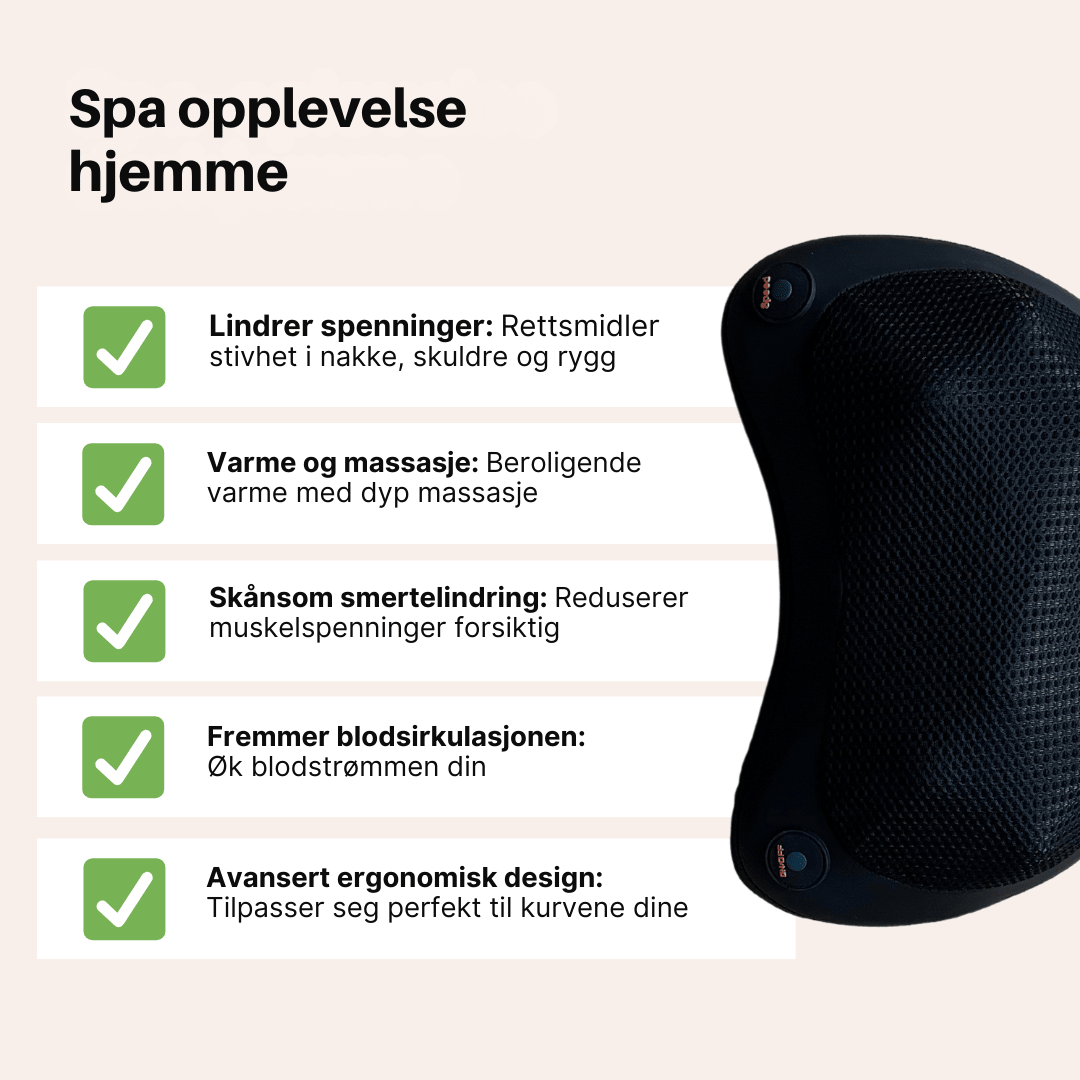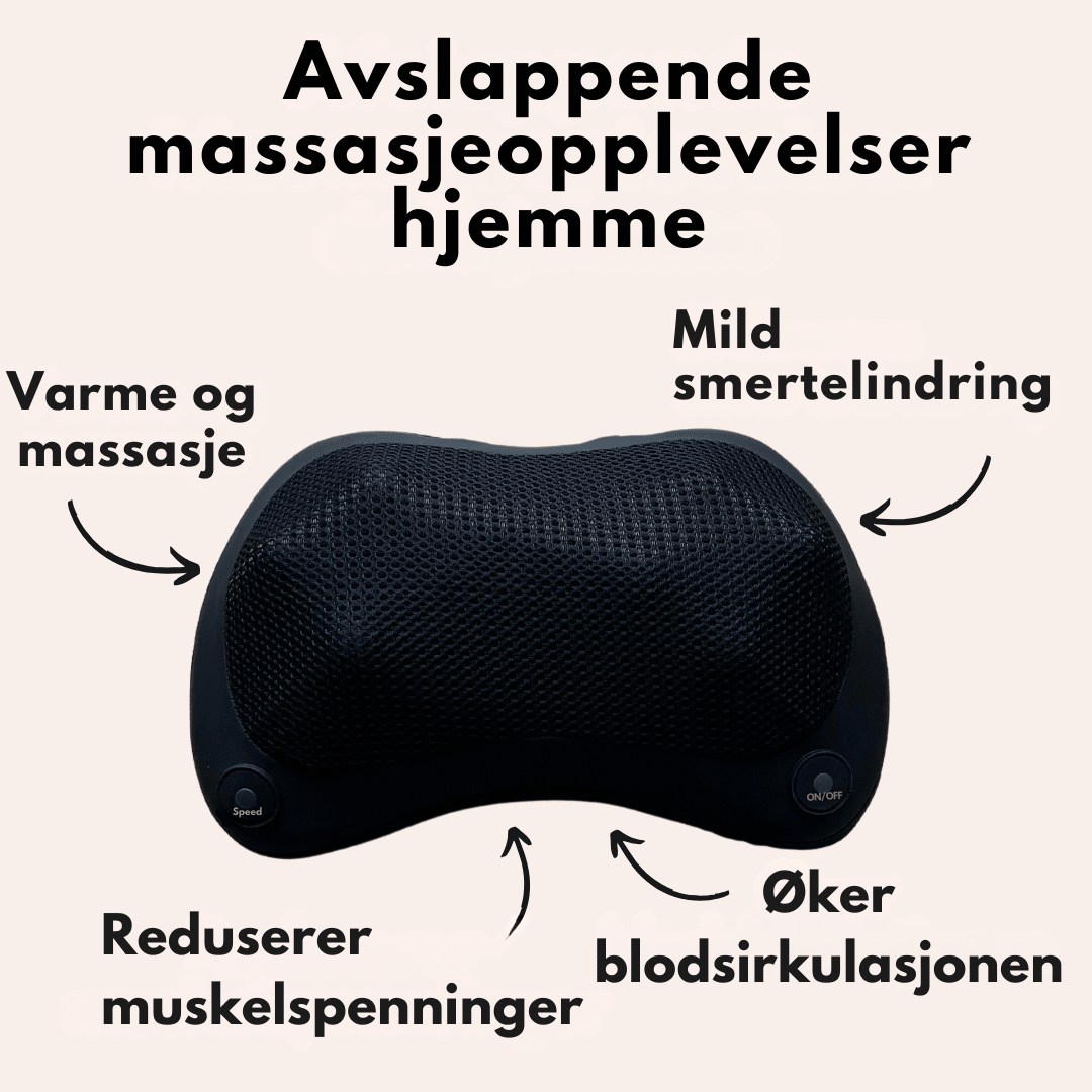 Oppdag en ny måte å slappe av på med RelaxFlex Massasjeputen, designet for å gi deg profesjonell massasje-kvalitet hjemme. Denne innovative massasjeputen kombinerer kraftfulle, roterende massasjehoder med en skånsom varmefunksjon, som sammen lindrer muskelspenninger, forbedrer blodsirkulasjonen og hjelper til med å redusere smerter og stivhet i nakke, skuldre og rygg. Enten du trenger smertelindring etter en lang dag eller en dyp avslapning etter trening, er RelaxFlex Massasjeputen det perfekte valget for alle som ønsker velvære på en enkel og praktisk måte.